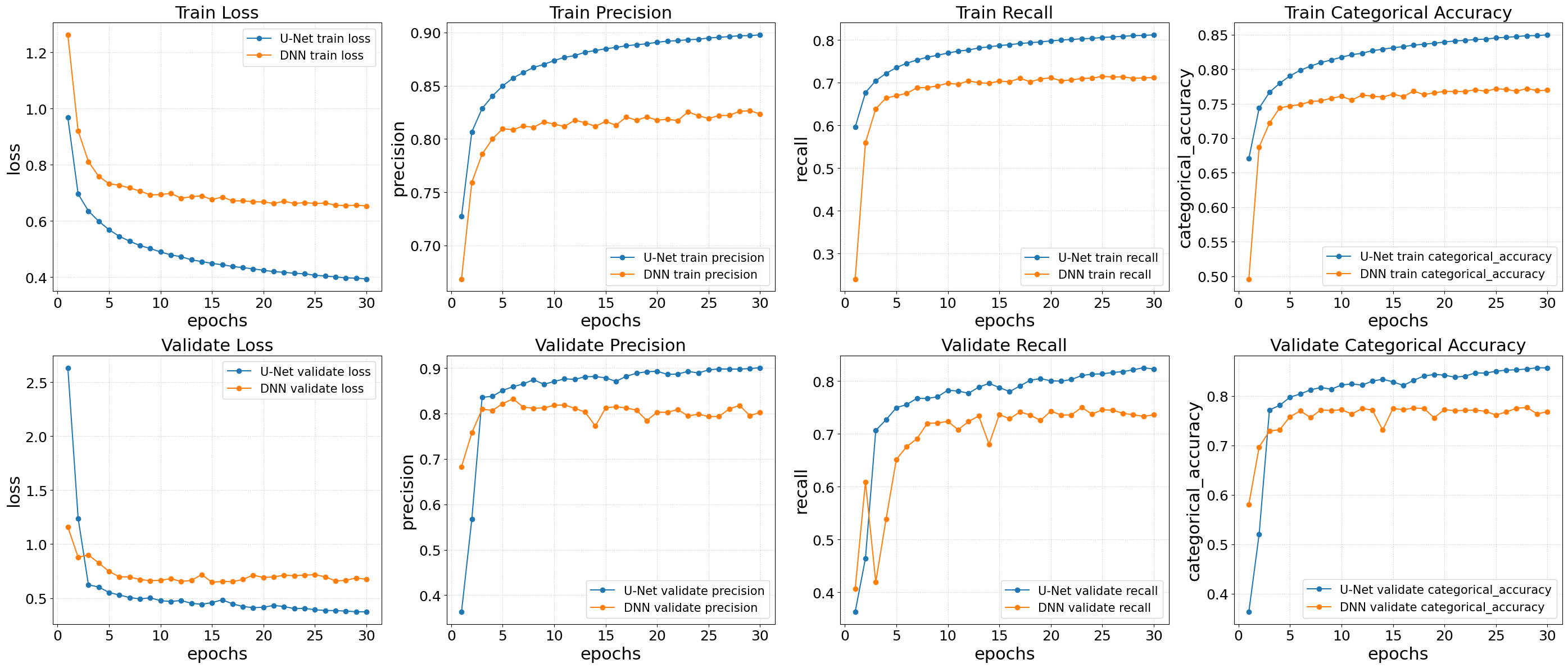 axs[y].plot(epochs, unet_model_metrics[f"val_{metrics[y]}"], color=colors[0], marker="o", lw=lw, label=f"U-Net validate {metrics[y]}")